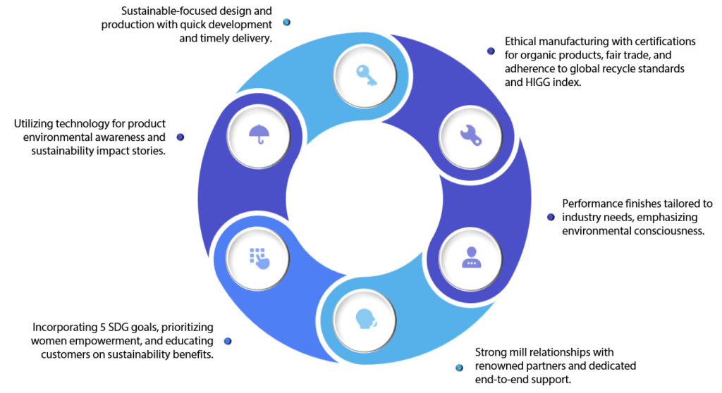 Our strengths are design to deliver capabilities, virtual vertical setup, raw material to finished goods—a one-stop solution—and tech-based service and communication.